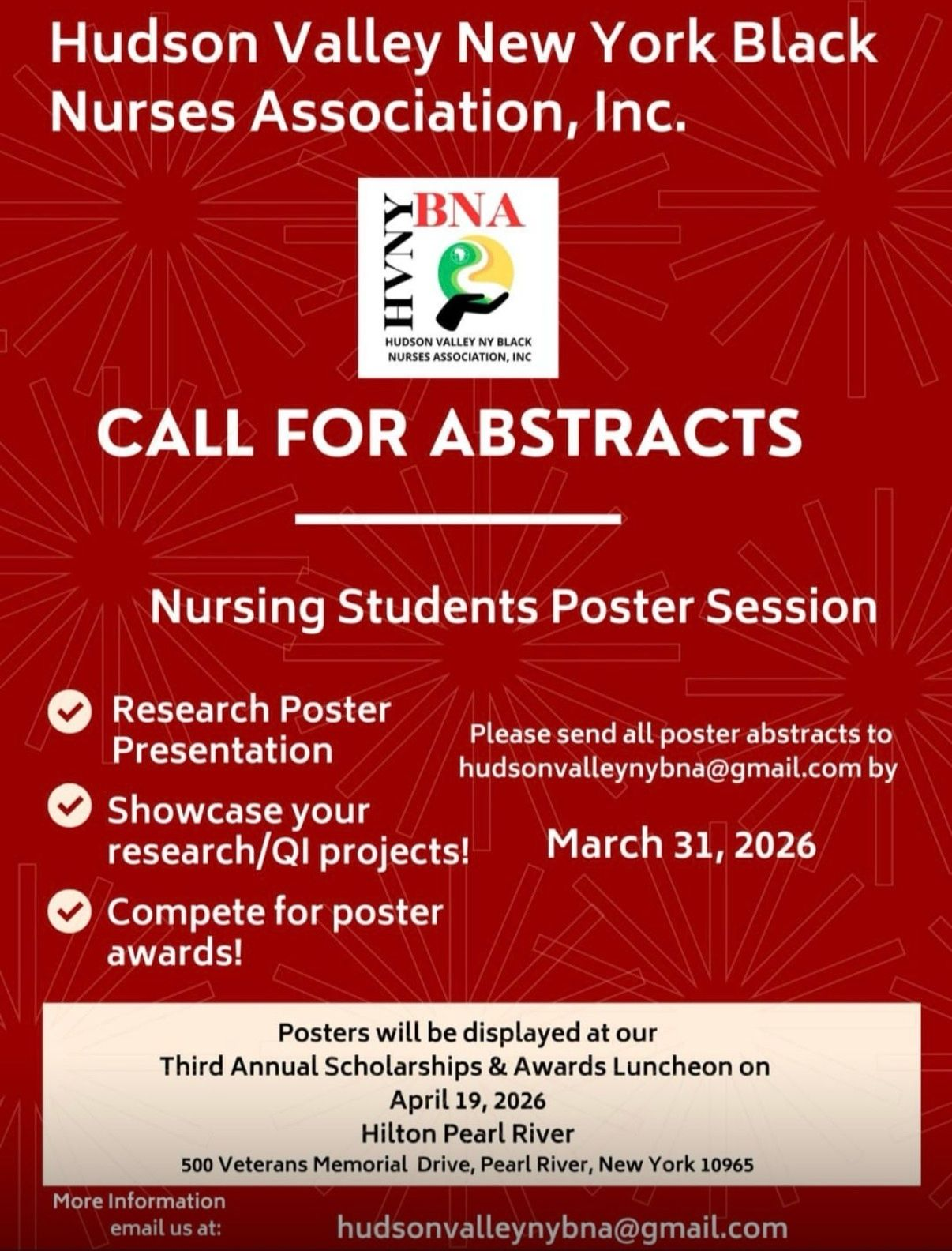 The Hudson Valley New York Black Nurses Association (HVNYBNA) is pleased to invite nursing students to submit abstracts for our Nursing Students Poster Session as part of our Third Annual Scholarships & Awards Luncheon.